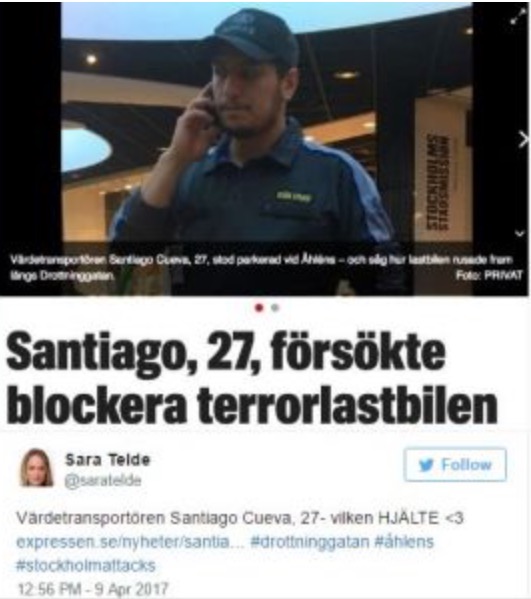 Roja 27-vjeçar, Santiago Cueva, me një akt heroik ka parandaluar pasoja më të mëdha të sulmit terrorist të së premtes në kryeqytetin e Suedisë, kur një uzbek që simpatizon ISIS-in, me mjet të fuqishëm kaloi në turmën e kalimtarëve. Katër persona vdiqën e 15 u plagosën me këtë rast.