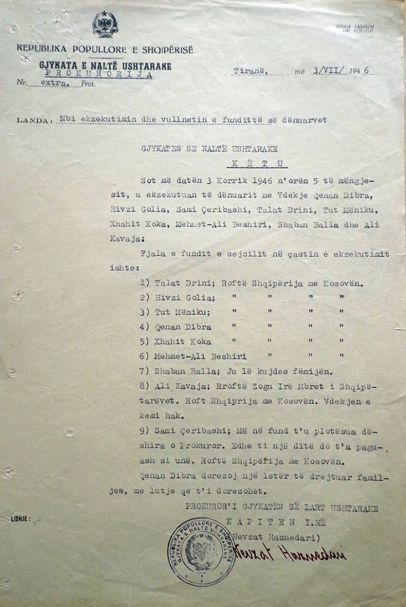 Sot më datën 3 korrik 1946 në orën 5 të mëngjesit u ekzekutuan të dënuarit me vdekje Qenan Dibra, Hivzi Golia, Sami Çeribashi, Talat Drini, Tut Mëniku, Xhahit Koka, Mehmet Ali Beshiri, Shaban Balla dhe Ali Kavaja. Fjala e fundit e secilit në çastin e ekzekutimit ishte:
