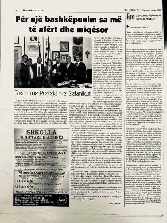 Shoqata “Shqiptarët e Selanikut”, konsullata shqiptare, në bashkpunim, ndihmën morale dhe 100% financiare të Prefekturës së Selanikut, dhe direkt Prefektit Panajotis Psomiadhis.