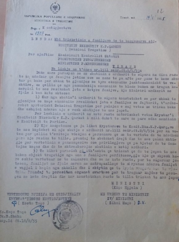 Ky urdhër është lëshuar nga Ministria e Tregtisë dhe bën fjalë mbi triskëtimin e familjeve të të burgosurve etj.