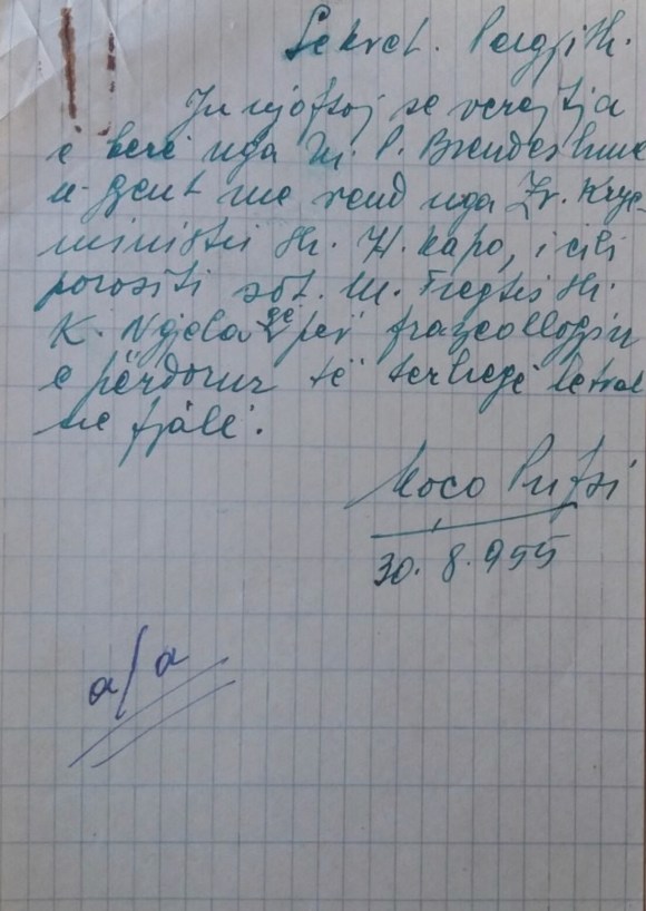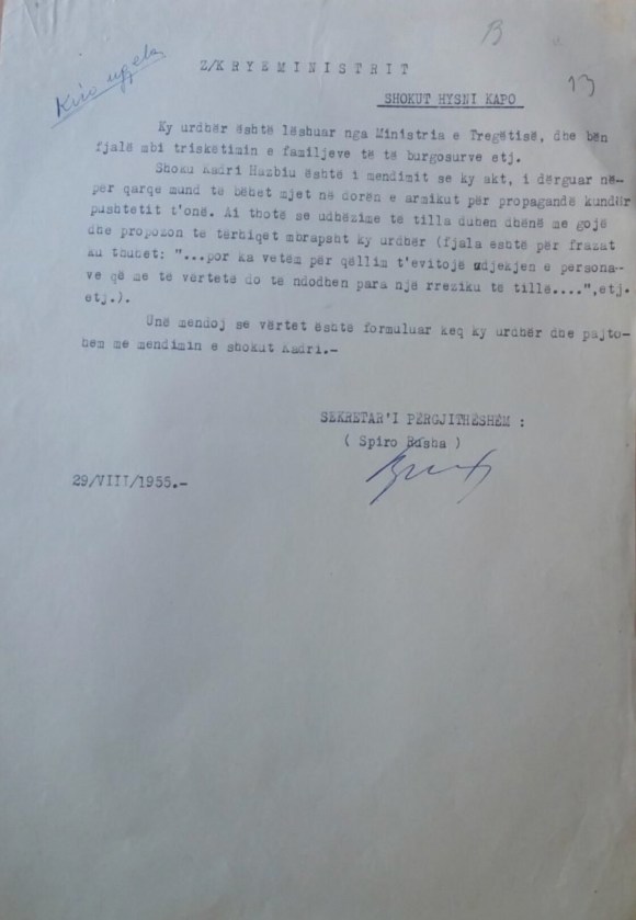 Ju njoftojmë se vërejtja e bërë nga M.P. Brendshme u gjet me vend nga zv.kryeministri Hysni Kapo, i cili porositi sot M.Tregtisë sh. Kiço Ngjela që për frazeologjinë e përdorur të tërheqë letrat në fjalë.