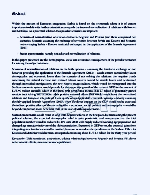 Kështu rekomandojnë gjashtë ekspertë serbë nëpërmjet një raporti me titull: ‘Efektet ekonomike, demografike e sociale dhe skenarët e ndryshëm për normalizimin e raporteve midis Beogradit dhe Prishtinës”, i botuar në prill të vitit 2018 dhe i përkrahur nga Fondacioni për Shoqëri të Hapur në Beograd, të cilin ka arritur ta sigurojë gazeta ‘Zëri”.