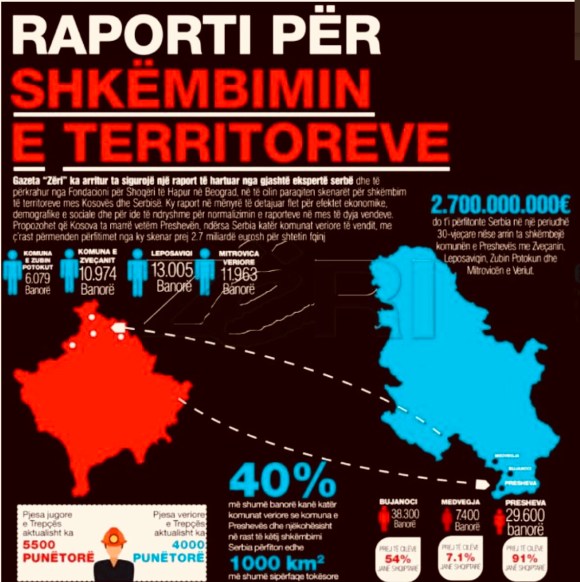 Gazeta ‘Zëri’ ka arritur ta sigurojë një raport të hartuar nga gjashtë ekspertë serbë dhe të përkrahur nga Fondacioni për Shoqëri të Hapur në Beograd, në të cilin paraqiten skenarët për shkëmbim të territoreve mes Kosovës dhe Serbisë.
