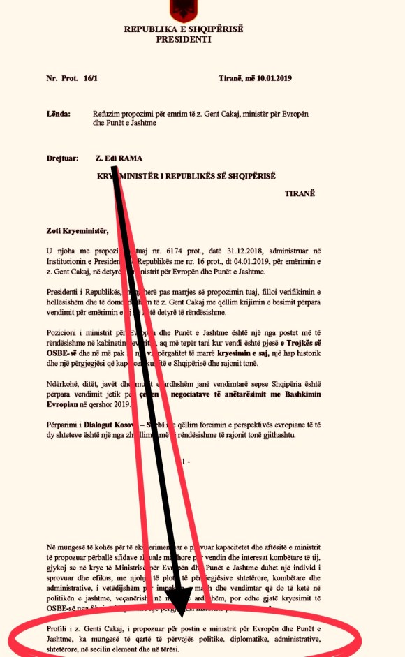 Në këto kushte, Presidenti i Republikës, në përmbushje të detyrimeve kushtetuese si Kreu i Shtetit, si Kryetar i Këshillit të Sigurisë Kombëtare dhe rolit të tij specifik kushtetues në politikën e jashtme të shtetit shqiptar, refuzon propozimin tuaj nr. 6174 prot., datë 31.12.2018, për emërimin e z. Gent Cakaj, në detyrën e ministrit për Evropën dhe Punët e Jashtme të Republikës së Shqipërisë.