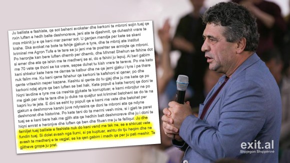 “Ju ballistë [anëtarët e partisë politike antikomuniste nacionaliste antike të Luftës së Dytë Botërore] dhe fashistët që janë bërë avokatë të popullit tuaj, duke prishur dhe duke mërzitur dëshmorët, ju jeni ata që keni nevojë të vriteni më parë, kështu që ju nuk mund të mbini dhe të inkurajoheni. Nuk ka asnjë avokat në këtë tokë i cili mund të fshijë gjakun e tyre dhe të mbrojë atë institut kriminal (ISKK) me Agron Tufa dhe të tjerët në të, – ti je më keq skandaloz se armiqtë që mbron …