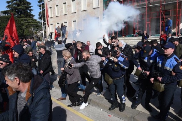 Protestors run from tear gas in Tirana, Albania during February protests calling for the resignation of the prime minister over corruption allegations. Photo: GENT SHKULLAKU/AFP/Getty Images
