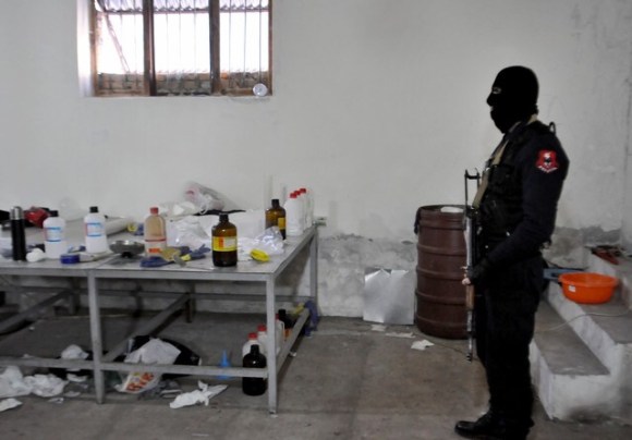 An Albanian police officer searches a clandestine cocaine refining laboratory in the village of Xibrake, near Elbasan, on January 15, 2015. Photo: AFP/Getty Images