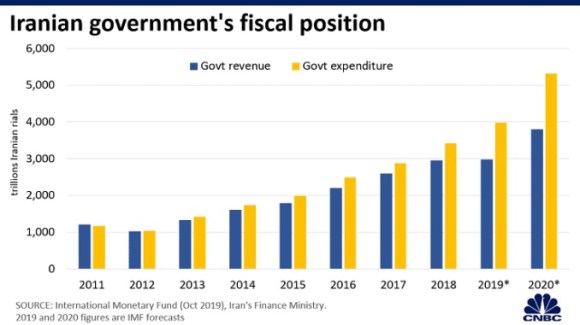 Qeveria iraniane ka financa të kufizuara për të përcaktuar masa për të hequr ekonominë e vendit. Kjo është përkeqësuar nga aktiviteti i përgjithshëm i ekonomisë dhe kufizimet e shitjes së naftës jashtë shtetit, për shkak të sanksioneve në fuqi.