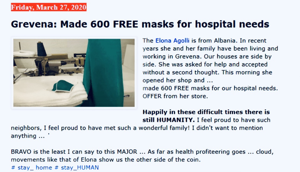 Ky veprim i ka lënë pafjalë drejtuesit e spitalit dhe jo vetëm, ku një nga mediat greke Vatolakkiotis e ka publikuar lajmin dhe ka shkruar ‘’ BRAVO është më e pakta që mund t’i them kësaj zonje … Për sa i përket përfitimit të shëndetit …, gjestet si ajo e Elonës na tregojnë anën tjetër të medaljes.”
