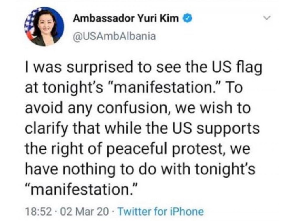Dalja në moment e presidentit Ilir Meta me flamurin amerikan solli reagimin e ambasadores amerikane Yuri Kim, e cila shkruante se, nuk kishin asnjë lidhje me tubimin në bulevard.