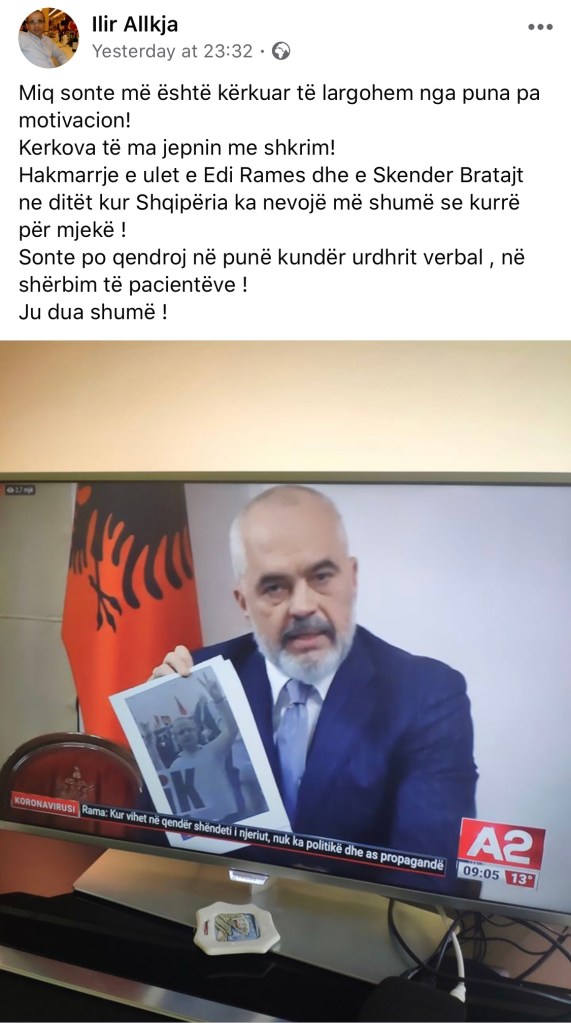 Solidaritet me mjekun Ilir Allkja dhe të gjithë mjekët e tjerë, të cilët po bëjnë maksimumin për të mbrojtur jetët tona.