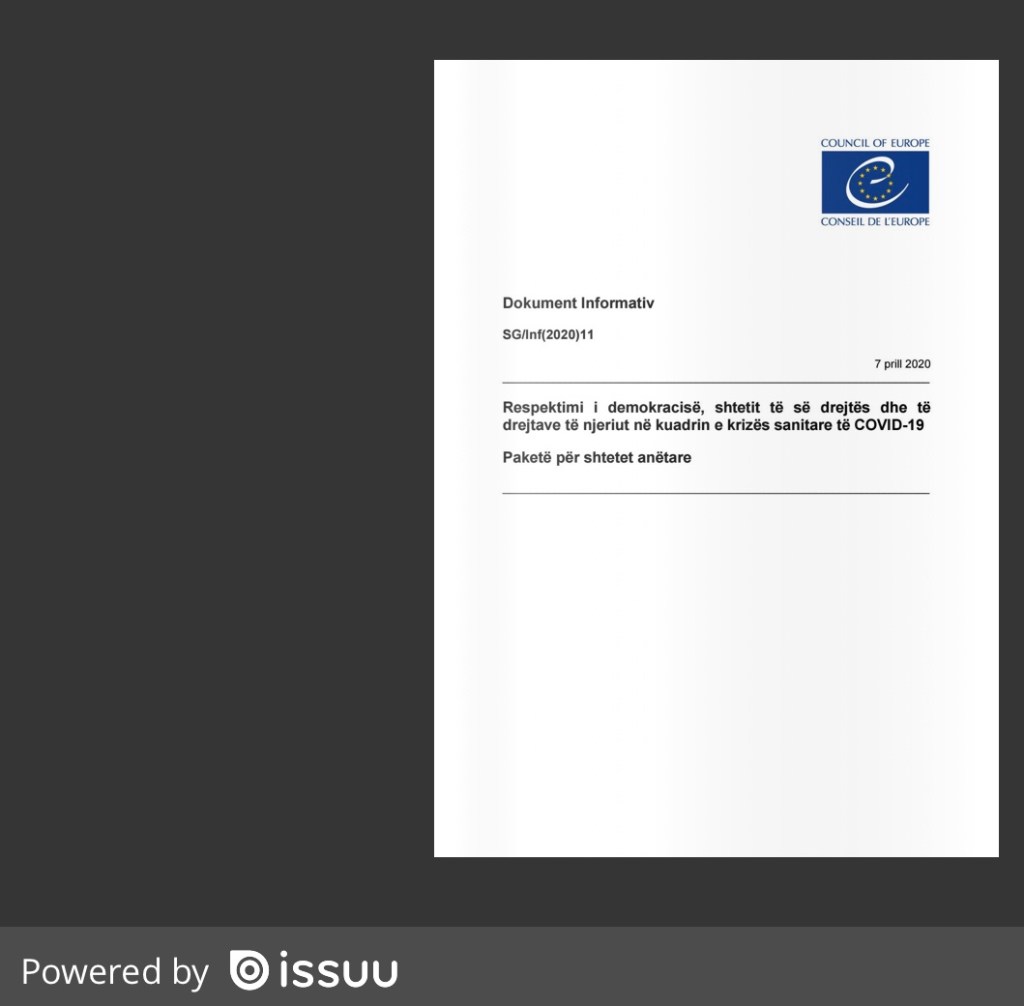 Këshilli i Europës ka publikuar këto ditë një dokument detyrues për gjithë vendet anëtare, ku bën pjesë dhe Shqipëria. Dokumenti drejtuar gjithë qeverisë rekomandon që gjatë pandemisë së koronavirusit të bëhet kujdes në miratimin e ligjeve që cenojnë liritë dhe të drejtat e njeriut. KiE thekson se çdo ligj apo vendim qeveritar duhet të ketë fuqi të përkohshme dhe të përcaktuar qartë.