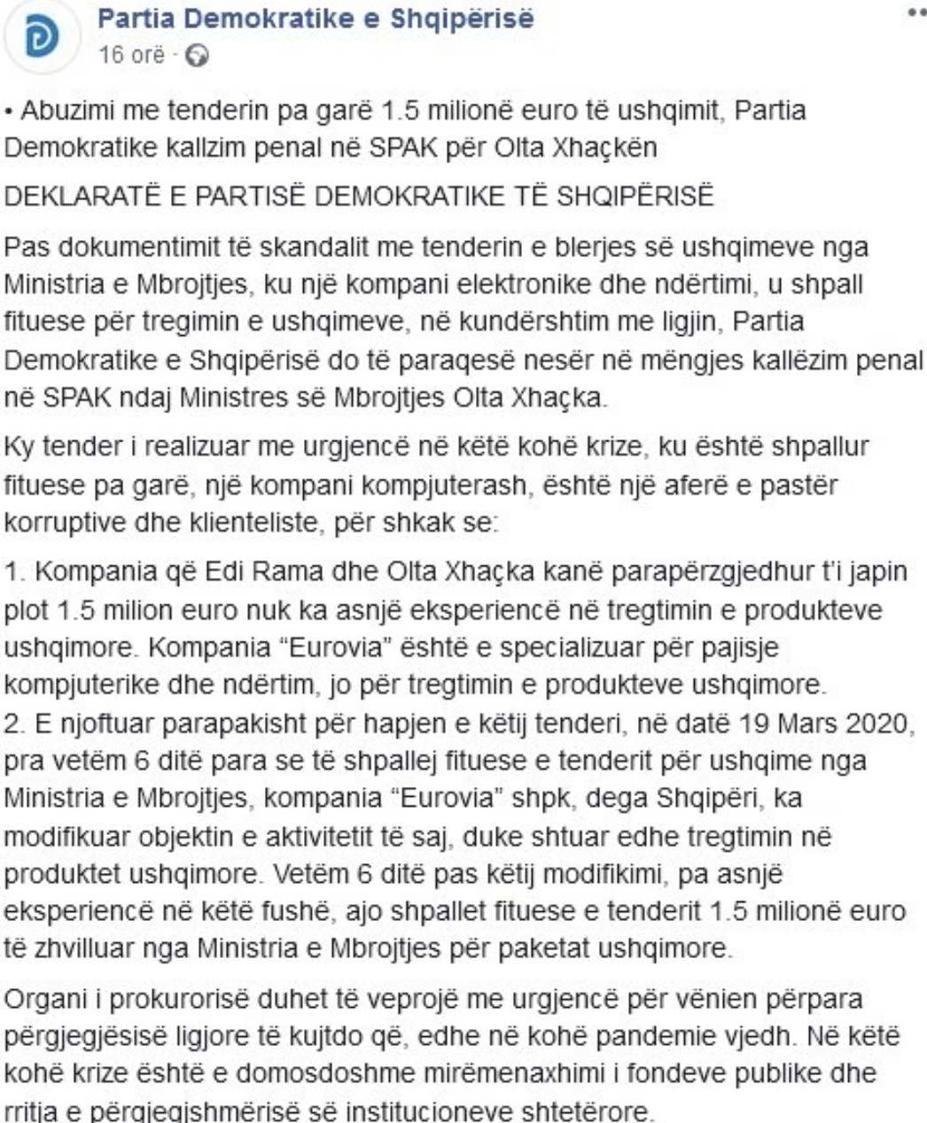 Pra, ne gjithashtu kemi një nivel shumë të pabalancuar të kujdesit në Shqipëri, veçanërisht jugu dhe veriu janë shumë më keq se Tirana. Pothuajse gjithçka mungon, pajisjet mjekësore, maska mbrojtëse dhe kostume. Kryeqyteti i BE-së dhe Sh.B.A, i cili vitet e fundit duhet të investohet edhe në sektorin e shëndetësisë, duket se është futur në xhepa të tjerë, në xhepat e përfaqësuesve të qeverisë së administratës Rama.
