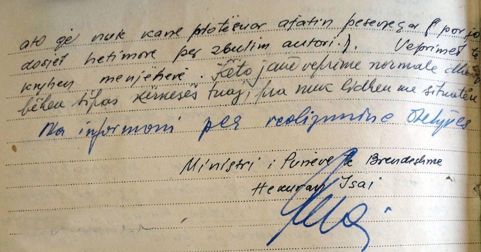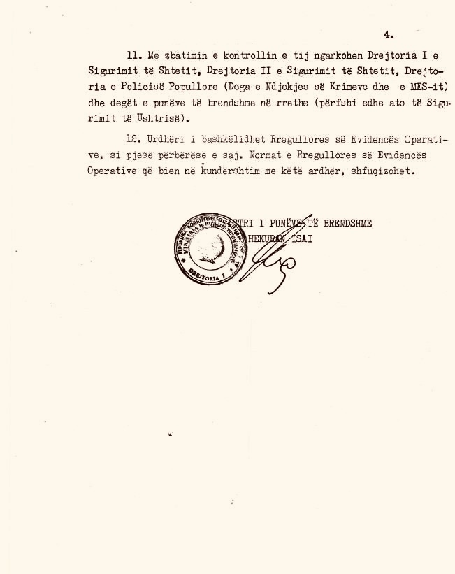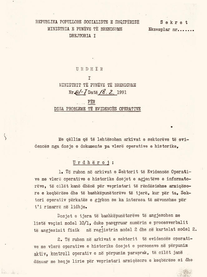 “Të angazhohen pa pritur përfaqësuesit e Ministrisë, të gjitha dosjet e bashkëpunëtorëve, të përpunimeve dhe dosjet e tjera që janë veçuar për asgjësim, si dhe kartelat e kontingjenteve të hequr, librat e evidencës së punëtorëve operativ të hequr nga përdorimi dhe dokumenteve e përkohshme të veçuara për asgjësim të shkallës sekret, Ares personal dhe SRV dosjet hetimore e gjyqësore të dërgohen në Arkiv, përfshi dhe ato që nuk kanë plotësuar afatin 5 vjeçar por jo dosjet hetimore për zbulimin e autorëve. Këto janë veprime normale që bëhen sipas kërkesës suaj, pra nuk lidhen me situatën. Për sa më sipër na lajmëroni për realizimin e kësaj detyre.”
