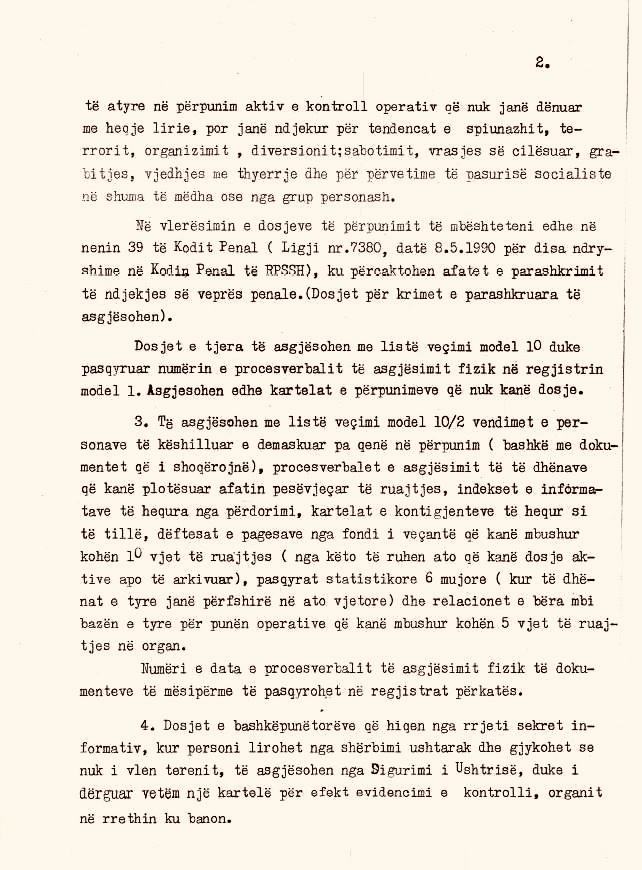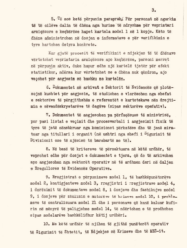 Të ruhen… dosjet e personave në përpunim aktiv, kontroll operative në përpunim paraprak, .. të dënuar.. për veprimtari armiqësore e keqbërëse si dhe të atyre që nuk janë dënuar..por janë ndjekur për tendenca spiunazhi, terrori,organizimit, diversionit, sabotimit e ….. Në vlerësimin e dosjeve të përpunimit të mbështeteni në ndryshimet e KP.. (Dosjet për krimet e parashkruara të asgjësohen). Dosjet e tjera si dhe kartelat e përpunimeve që nuk kanë Dosje të asgjësohen.. si dhe shumë lloje të tjerash dosjesh e dokumente…