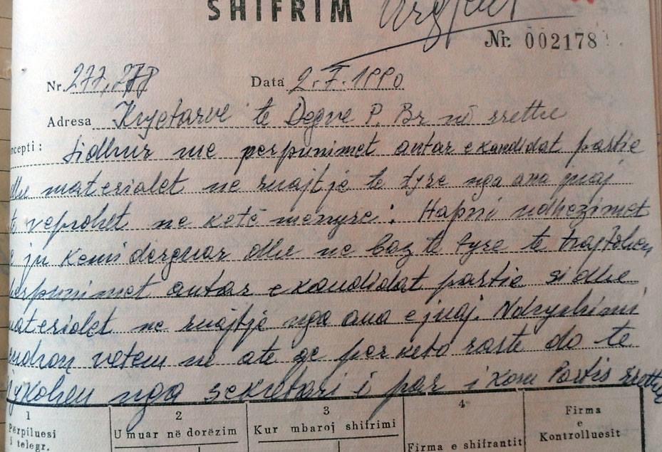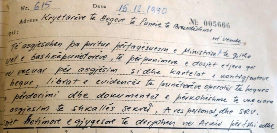 Radiogrami “urgjent” që Ministri i kohës Simon Stefani i dërgon Kryetarëve të Degëve të Punëve të Brendshme në rrethe më datë 2 korrik 1990 me nr. 277,278: “lidhur me përpunimet anëtarë e kandidatë partie, si dhe materialet në ruajtje të veprohet në këtë mënyrë: Ato për ta të shqyrtohen nga sekretari i parë i rrethit… të ruhen vetëm ato për spiunazh dhe organizime”….ndërsa “ato që janë ruajtur thjesht për agjitacion e propagandë e që me Ligjin e ri nuk konsiderohen më të asgjësohen menjëherë.”….Asgjësimi të bëhet në bazë të rregullave. Kjo punë të përfundoj brenda 15 korrikut.”