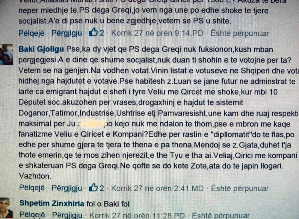 Pse habitesh zoteri se jane futur ne adminstrat te larte ca emigrant hajdut e shefi i tyre Veliu me Qircet me shoke , kur mbi 10 Deputet soc.akuzohen per vrases , drogaxhinj e hajdut te sistemit Doganor , Tatimor Industrise , Ushtrise etj Pamvaresisht , une kam dhe ruaj respekti maksimal per ju z…., po kejo nuk me ndalon te thom , pse e mbron me kaqe fanatizme Veliu e Qiricet e kompani ?