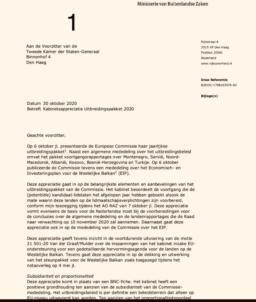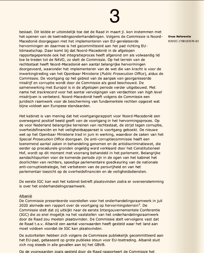 ‘Në vlerësimin e qeverisë Holandeze të 30 tetorit, qeveria shpjegon se KPM-ja e parë me Maqedoninë e Veriut mund të ndodhë sa më shpejt që kuadri i negociatave të jetë rënë dakord. Këshilli vendosi në Mars që KPM-ja e parë me Shqipërinë mund të zhvillohet nëse plotësohen kushtet e përcaktuara në konkluzionet e Këshillit të Marsit 2020.