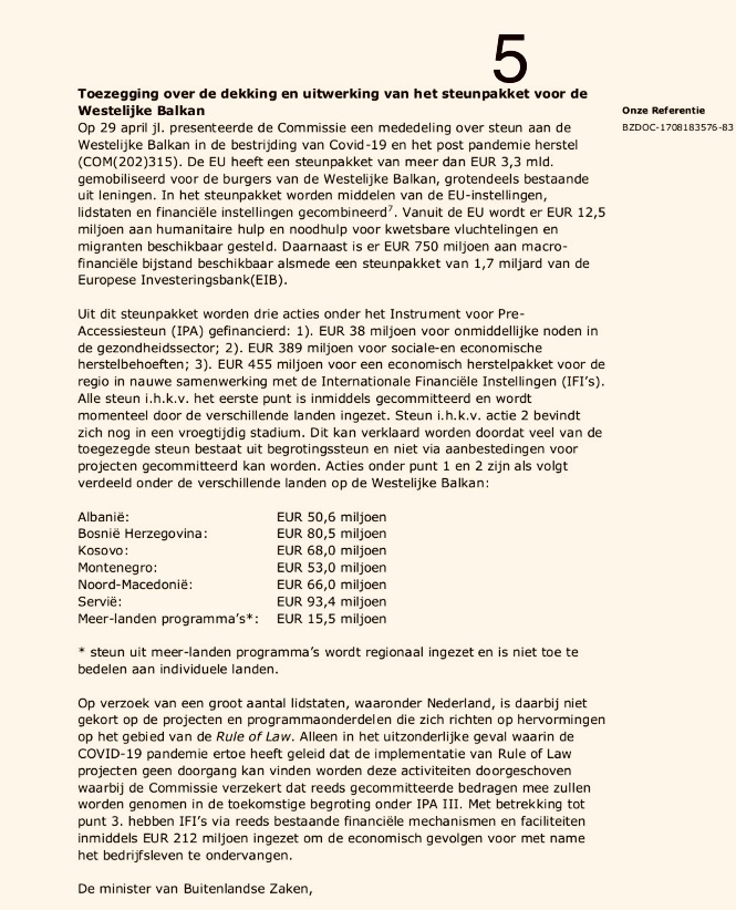 Qeveria (holandeze) mbështet analizën e Komisionit Europian se Shqipëria ka treguar përparim në fusha të ndryshme, por përfundimi i Komisionit se ‘pothuajse të gjitha kushtet janë përmbushur’ është i parakohshëm.