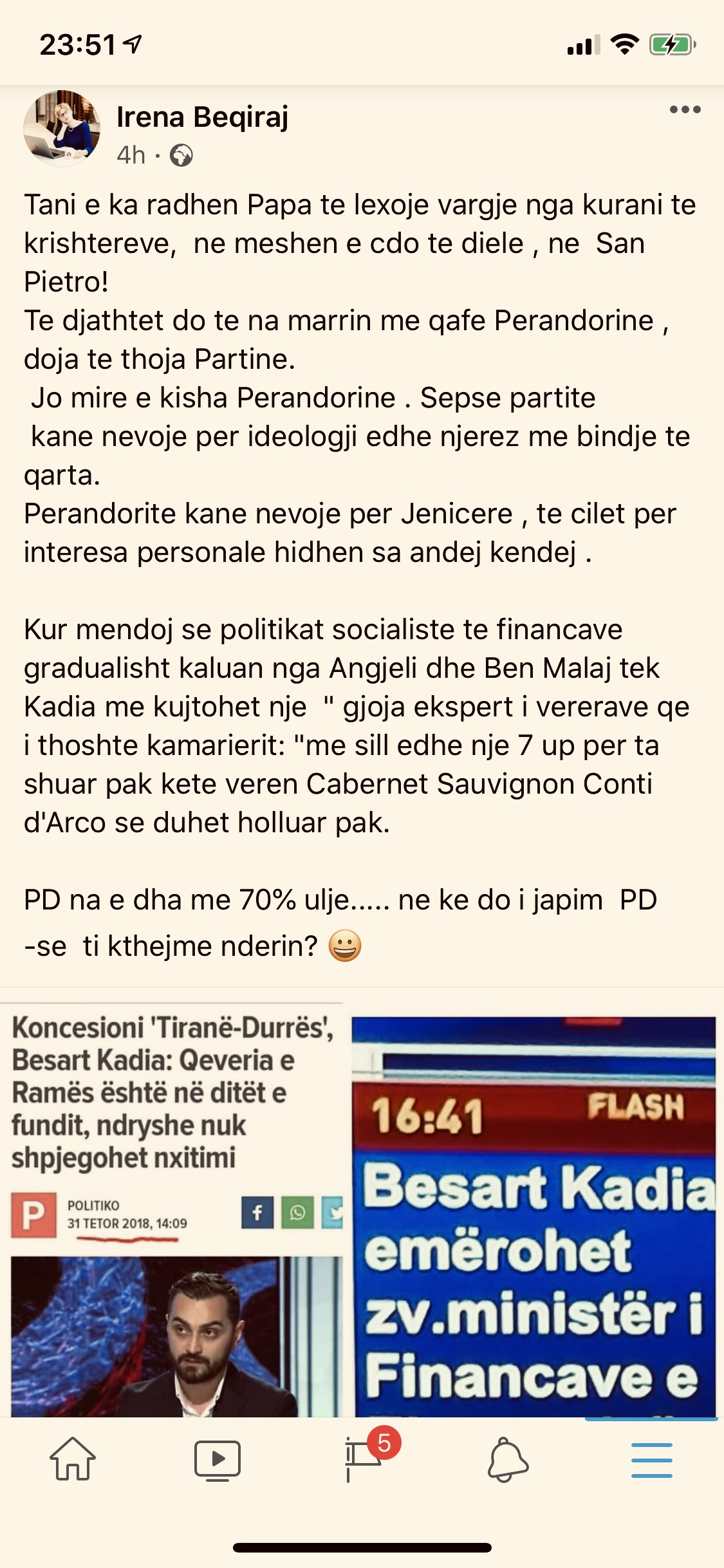 🌑 Tani e ka radhen Papa te lexoje vargje nga kurani te krishtereve, ne meshen e cdo te diele , ne San Pietro! Te djathtet do te na marrin me qafe Perandorine , doja te thoja Partine. Jo mire e kisha Perandorine . Sepse partite kane nevoje per ideologji edhe njerez me bindje te qarta. Perandorite kane nevoje per Jenicere , te cilet per interesa personale hidhen sa andej kendej .