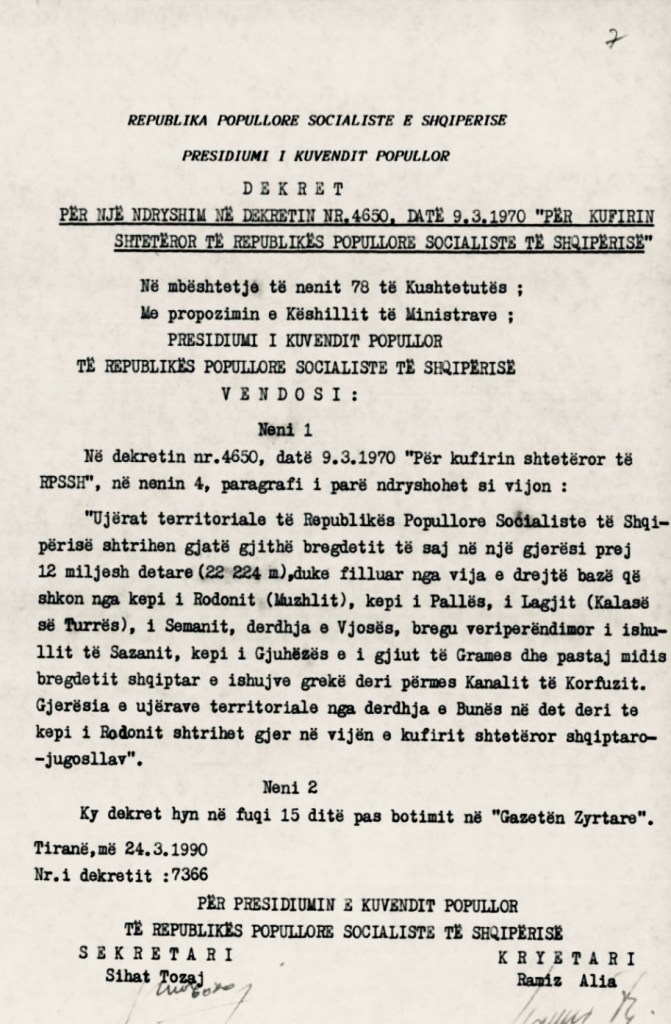 Me këtë dekret te autoriteteve greke, te pranuar ne një akt tradhtie te larte kometare nga Edvin Kristaq Zografi sipas Marrëveshjes se fshehte Rama-Dendia, kufijtë e Shqipërisë ndryshojnë për here te pare qe nga viti 1913 me pasoje humbjen, zvogëlimin nga ana saj te mijëra kilometrave katror te sipërfaqes se ujerave territoriale, shelfit kontinental dhe zonës ekonomike ne Detin Jon dhe humbjen e trilionave euro te depozitave te gazit dhe naftës qe tani kalojnë ne territorin helen.