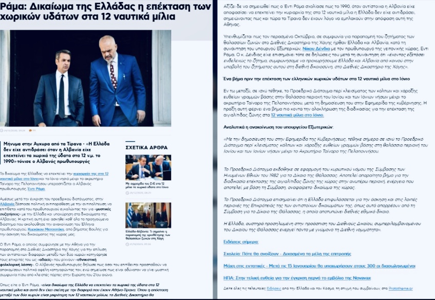 “E drejta e Greqisë për të zgjatur sovranitetin e saj në 12 milje detare në Ishujt Jon deri në Kepin Tainaro në Peloponez mbrohet nga kryeministri shqiptar Edi Rama“.