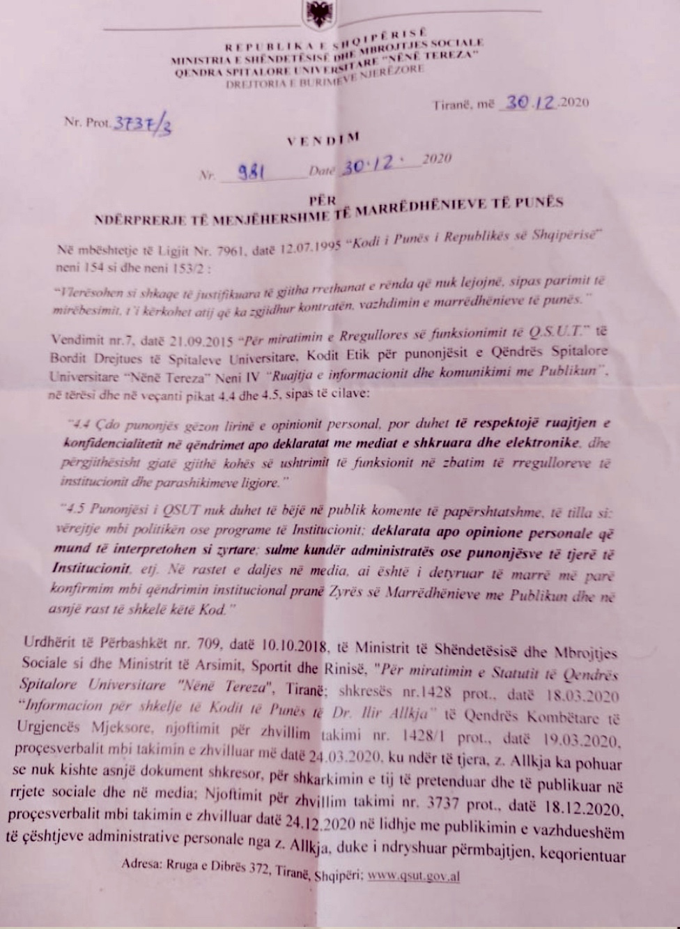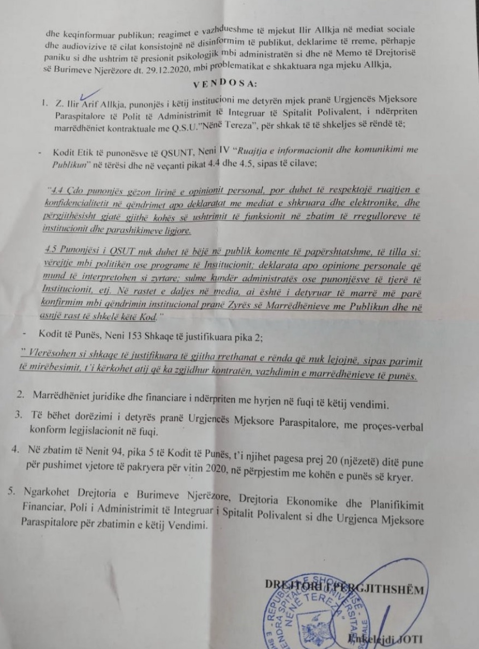 Sot bushtrat e pushtetit larguan nga puna mjekun e urgjencës Ilir Allkja, i cili punon atje prej 24 vitesh.