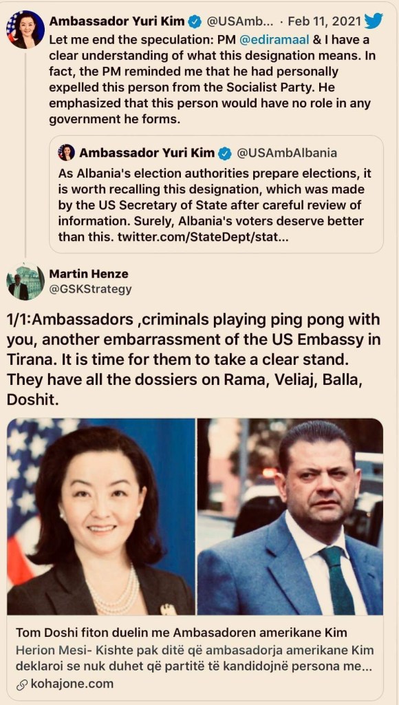 Edhe në Kosovë, vetëm pasi u hap ambasada amerikane arritën disa kriminelë si Hashim Thaçi, Veseli, apo Krasniqi të uzurpojnë Kryeministrinë, Kryesinë e Kuvendit dhe Presidencën. Duhet thënë, ndërkohë, se niveli etik dhe profesional i diplomatëve amerikanë në Prishtinë është shumë më i lartë se ai në Tiranë.