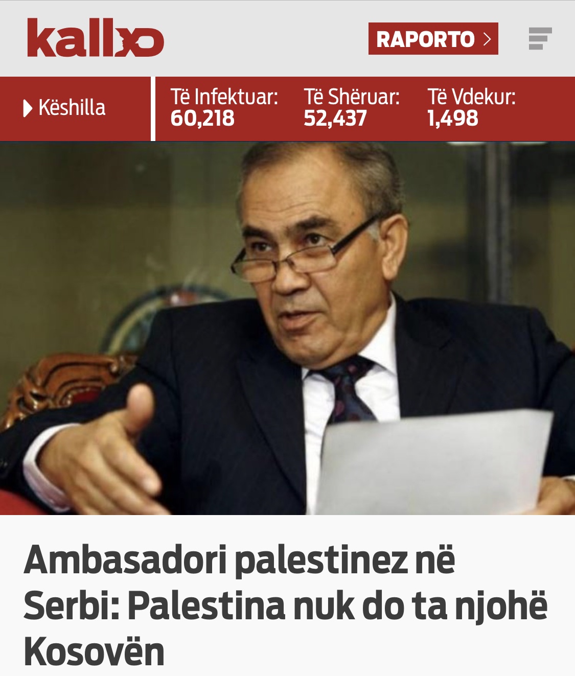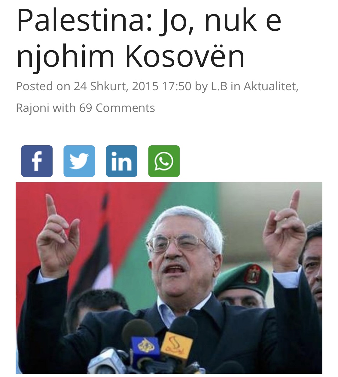 Ne habitemi që qeveritarët palestinezë dënuan publikisht shpalljen e pavarësisë në Kosovë. Njeriu që ka zëvendësuar Arafatin qe nga të parët që vizituan Serbinë dhe denoncoi pavarësinë e Kosovës si kundër ligjit ndërkombëtar. Mund ta bënte nga zyra e tij në territoret palestineze, po nuk është aq fyese për shqiptarët sesa kur e bën deklaratën nga Beogradi.