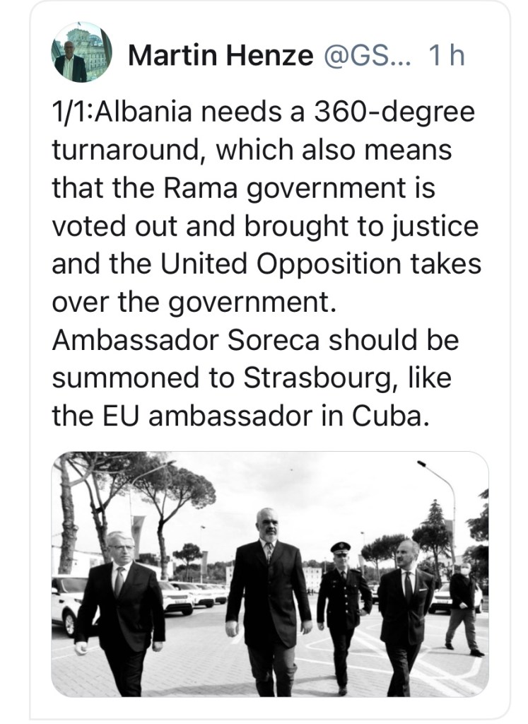 Me anë të një shkrimi në rrjetin social Tëitter, eksperti i ekonomisë pranë CDU-së gjermane, Martin Henze, ka kritkuar me tone të ashpra Ambasadorin e Bashkimit Europian në Shqipëri, Luigi Soreca.