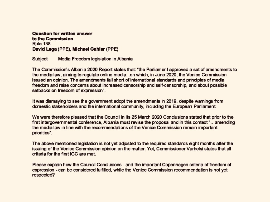 Eurodeputeti suedez, David Lega në një intervistë për ”ABC”, flet lidhur me amendamentet për Shqipërinë që do votohen nesër nga Komisioni i Punëve të Jashtme të Parlamentit Europian.