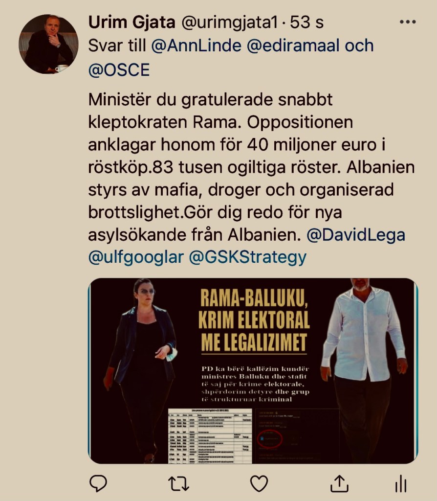 Vertet z.ministre e jashtëme, kaq papritur dhe me ngut , (një si ata që e kallin te vdekurin në dhe pa mbushur as 12 orë) … Ju uruat nè Twitter një kleptokrat, – një manipulues, – një diktator, që ka marrë dhe po mban peng me forcën e mafies dhe krimit te organizuar jo vetem partine socialiste, jo vetem pushtetin, por një popull të tërë.