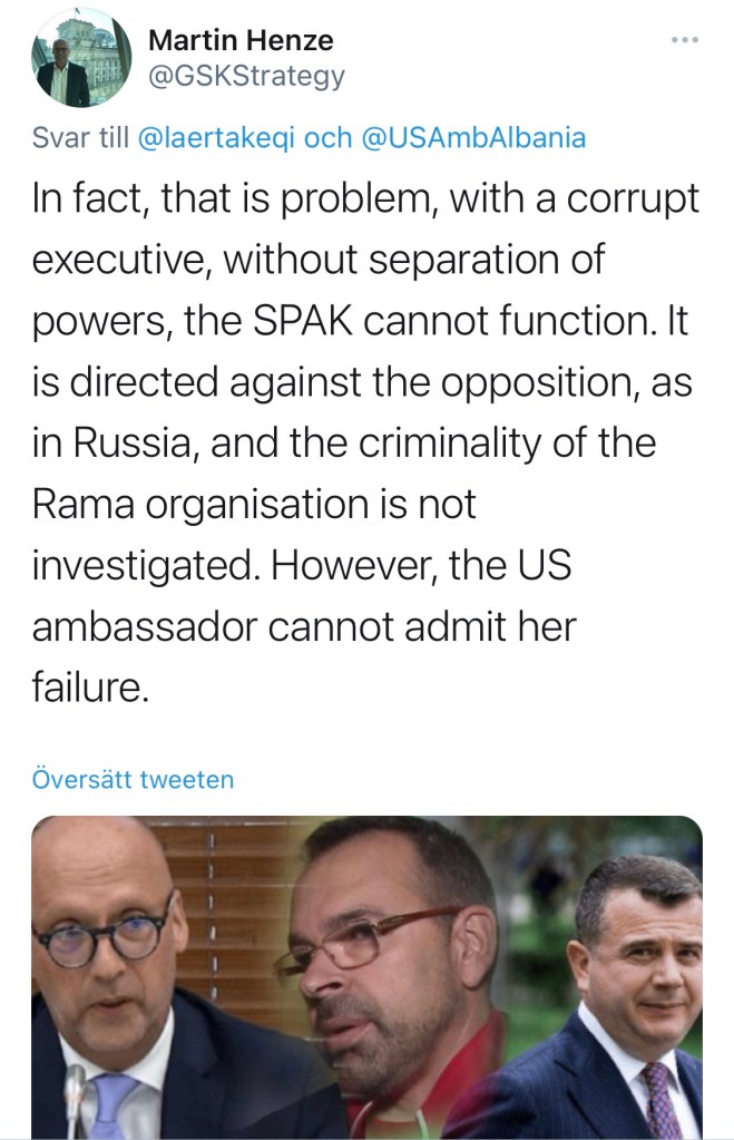 In fact, that is problem, with a corrupt executive, without separation of powers, the SPAK cannot function. It is directed against the opposition, as in Russia, and the criminality of the Rama organisation is not investigated. However, the US ambassador cannot admit her failure.