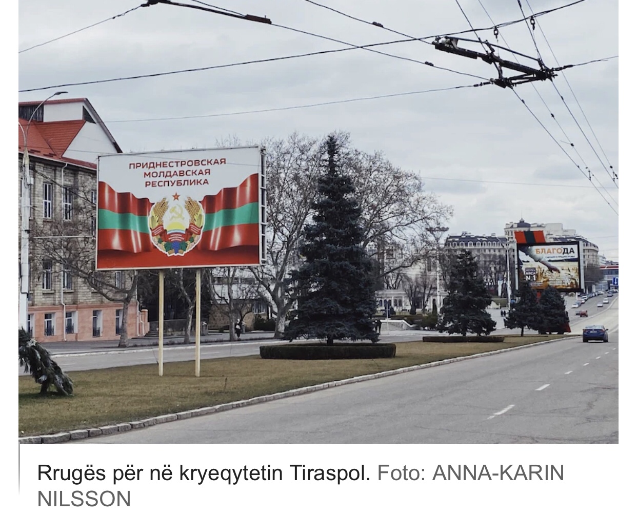 Në kryeqytetin Tiraspol kalojmë me makinë pranë selisë së trupave ruse. Flamuri i Transnistrisë valëvitet gjithandej, me çekiçin dhe drapërin në foto, ngjitur me atë të Rusisë. Në rrugë ka tabela të përsëritura që ndalojnë fotografimin.