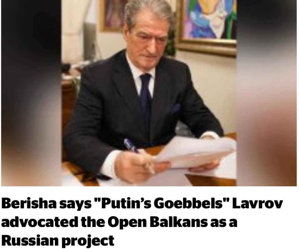 “Bloodthirsty dictator Putin’s Goebbels told the Serbian media he would be going to Belgrade for the Open Balkans project”, Berisha wrote.