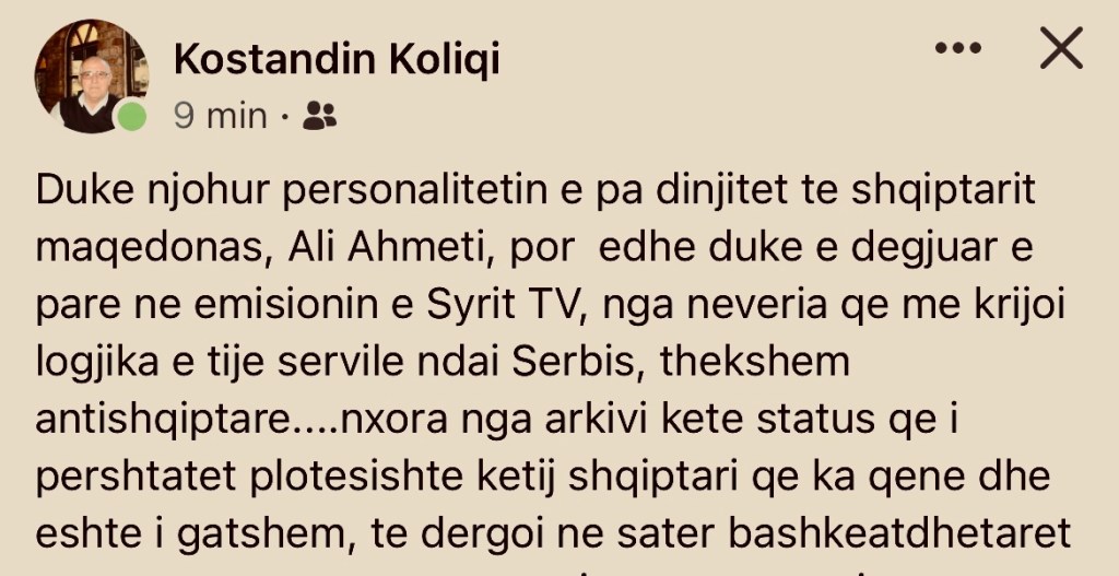 Duke njohur personalitetin e pa dinjitet te shqiptarit maqedonas, Ali Ahmeti, por edhe duke e degjuar e pare ne emisionin e Syrit TV, nga neveria qe me krijoi logjika e tije servile ndai Serbis, thekshem antishqiptare….