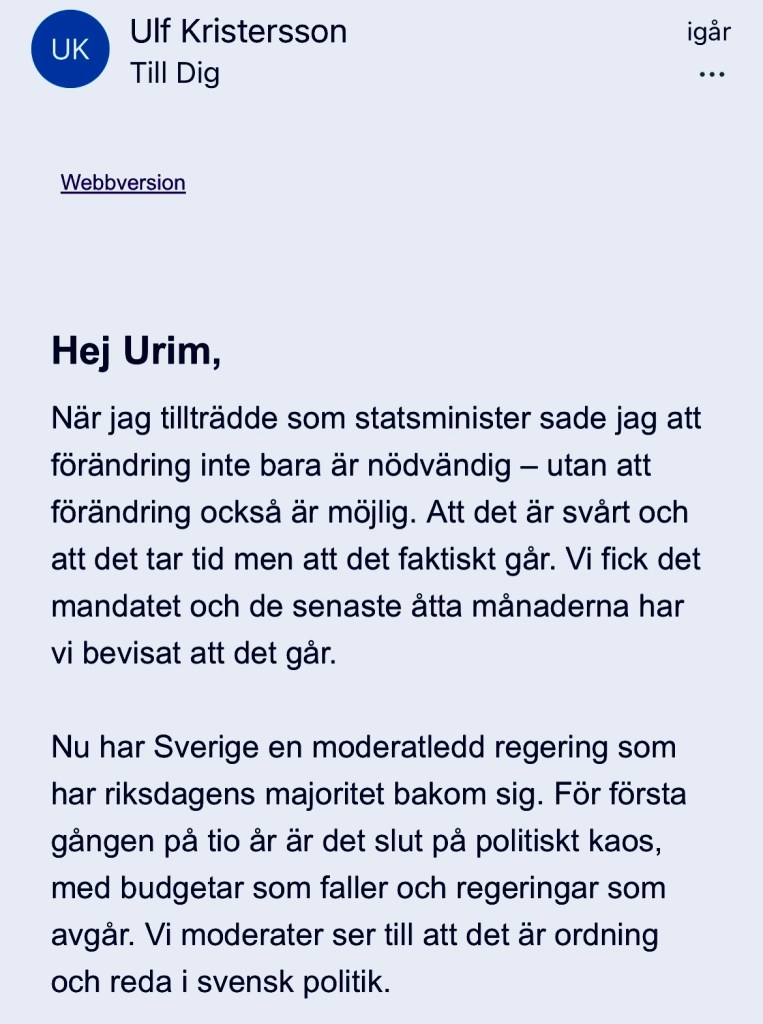 Hälsningar Ulf Kristersson Statsminister och partiledare