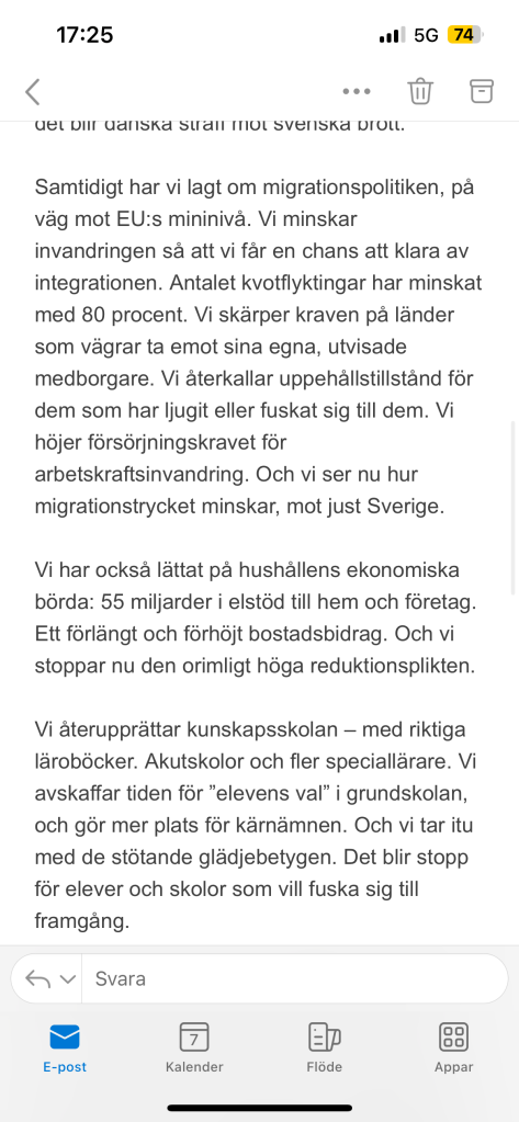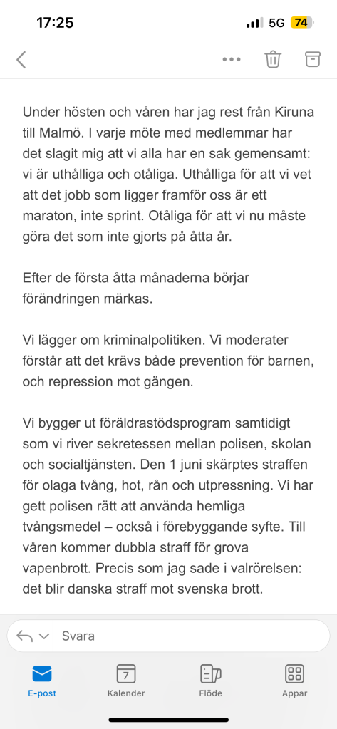 E gjithë kjo është falë të gjithë neve që tani po luftojmë për një Suedi më të mirë. Pavarësisht nëse është në qeveri, në qark, në komunë apo si anëtar. Ne bëjmë atë që duam dhe bëjmë atë që duhet. Dhe ne do të vazhdojmë ta bëjmë këtë derisa të kemi mposhtur inflacionin, derisa të ndalojmë të shtënat, derisa të kemi menaxhuar integrimin, derisa reaktorët e rinj të jenë gati - dhe derisa Suedia të bëhet anëtare e plotë e NATO-s.