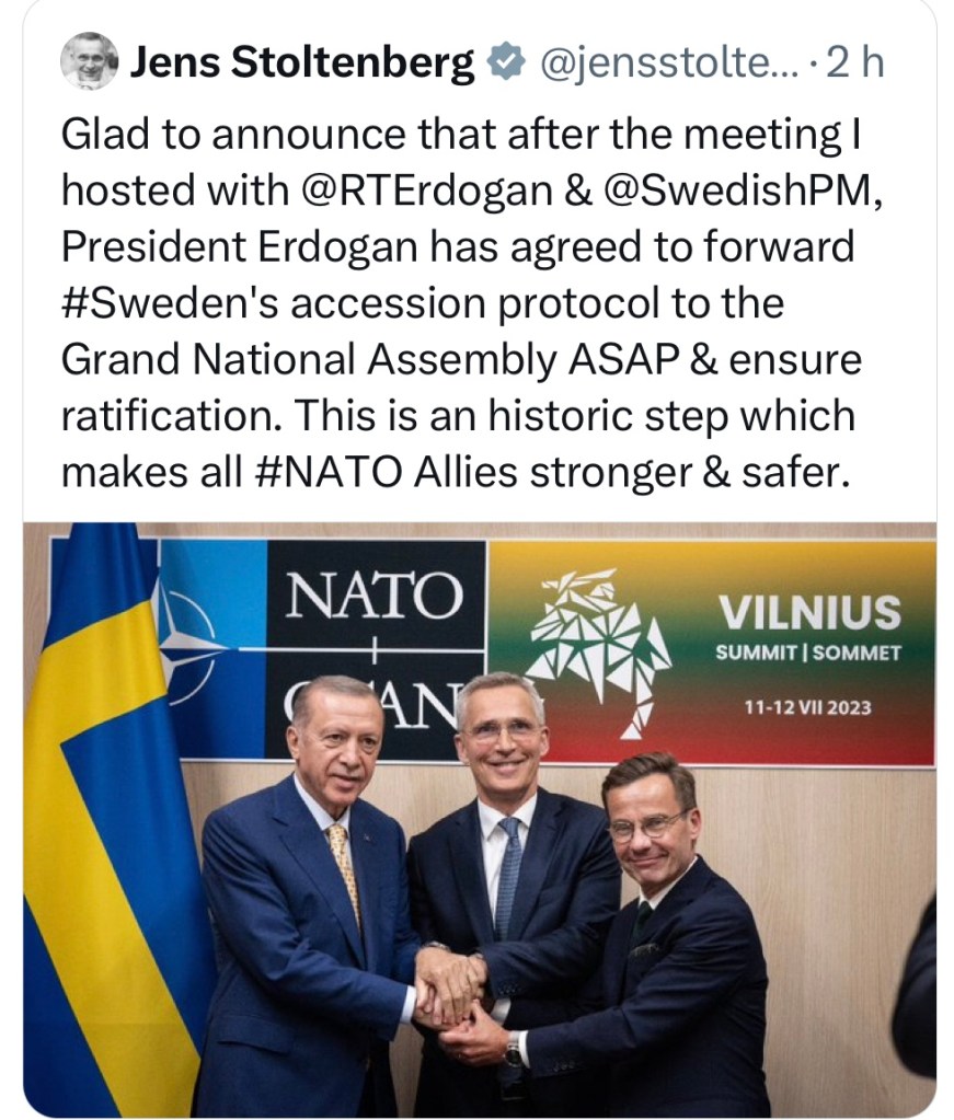 Gjysmë ore më parë, Sekretari i Përgjithshëm i NATO-s , Jens Stoltenberg, kishte thënë se Turqia kishte pranuar kërkesën e Suedisë në aleancën e mbrojtjes.