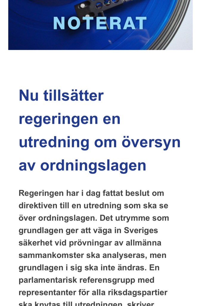 Mot den bakgrunden har regeringen i dag fattat beslut om direktiven till en utredning som ska se över ordningslagen. Det handlar om att förstärka Sveriges författningsberedskap mot olika typer av allvarliga hot mot svenskar och svenska intressen. Det vill säga, att vi nu säkerställer att det finns ett beslutsunderlag för att i framtiden kunna agera om situationen kräver det.