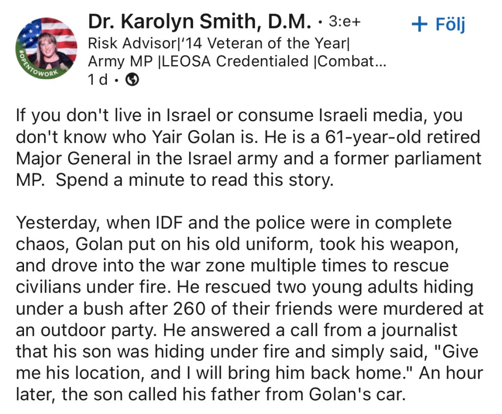 Golan collected a small crew and went in and out of the war zone, rescuing dozens of people while exchanging fire with Hamas terrorists. He is 61, he could have stayed home, but he chose to risk his life for people he does not know.