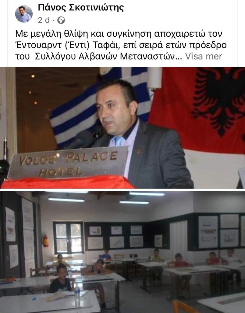 Με μεγάλη θλίψη και συγκίνηση αποχαιρετώ τον Έντουαρντ (Έντι) Ταφάι, επί σειρά ετών πρόεδρο του Συλλόγου Αλβανών Μεταναστών Ν. Μαγνησίας «Iliria», ο οποίος έφυγε τόσο πρόωρα και τόσο αναπάντεχα από τη ζωή.