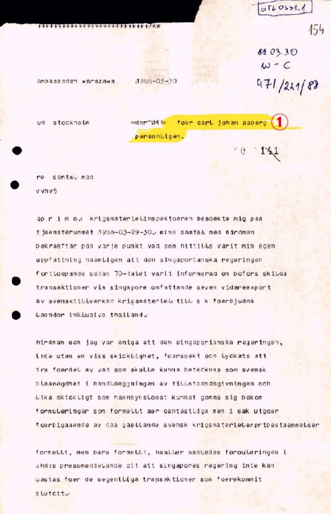 Polonia lexoi telegrame sekrete kripto 1988-03-30. Inspektori i materialeve të luftës Sven Hirdman takohet me ambasadorin në Varshavë, Jean-Christophe Öberg, i cili jep informacion rreth kontrabandës së armëve të Boforit në Azi. Një telegram personal për Sekretarin e Shtetit Carl Johan Åberg në Ministrinë e Punëve të Jashtme (1) është përgjuar nga kundërzbulimi polak edhe para se të kodohet më 30 mars 1988. Zmadhuar me xham zmadhues. qendër