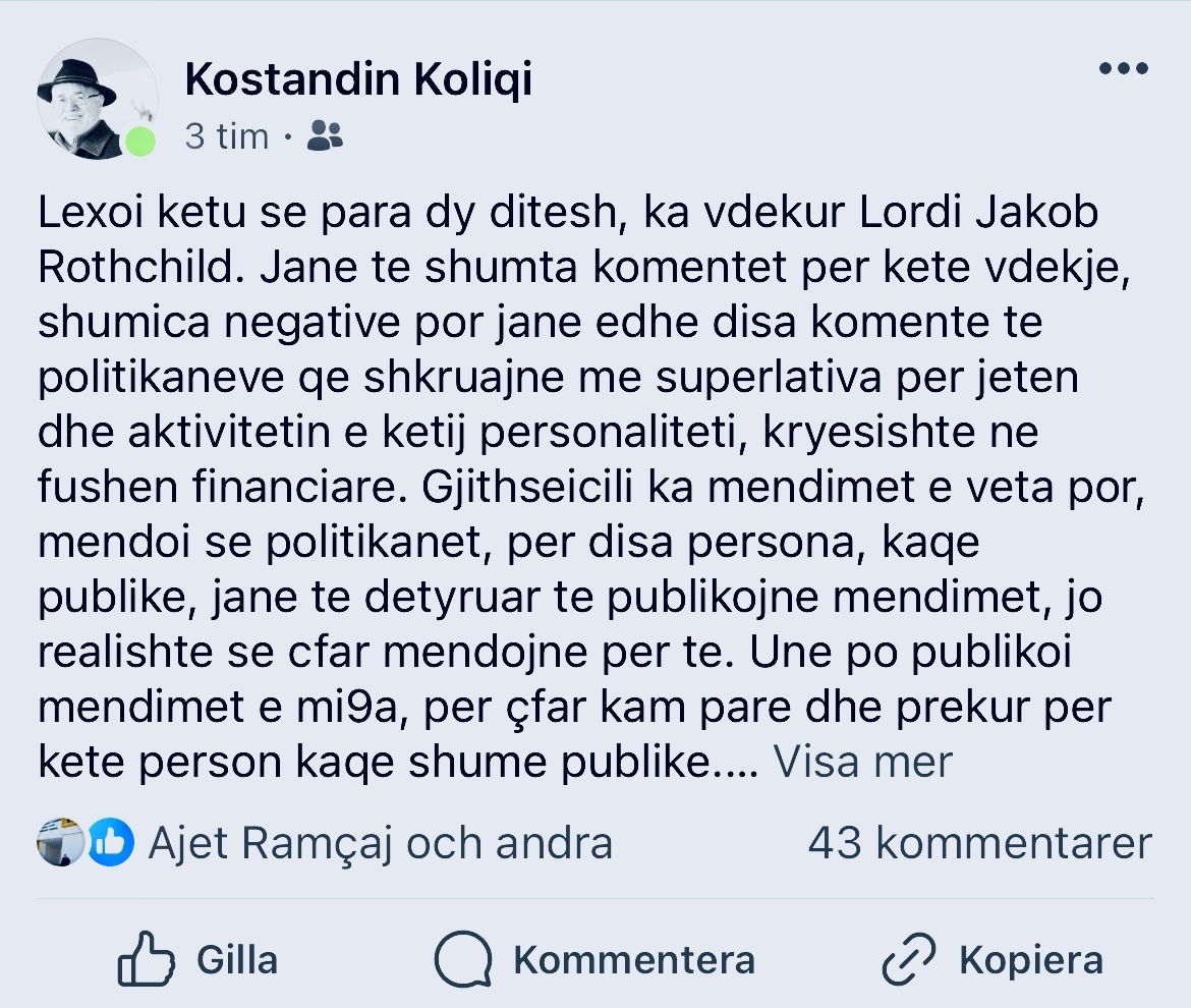 Lexoi ketu se para dy ditesh, ka vdekur Lordi Jakob Rothchild.