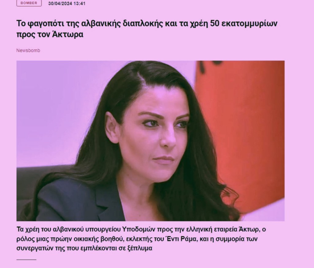 Το φαγοπότι της αλβανικής διαπλοκής και τα χρέη 50 εκατομμυρίων προς τον Άκτωρα Τα χρέη του αλβανικού υπουργείου Υποδομών προς την ελληνική εταιρεία Άκτωρ, ο ρόλος μιας πρώην οικιακής βοηθού, εκλεκτής του Έντι Ράμα, και η συμμορία των συνεργατών της που εμπλέκονται σε ξέπλυμα