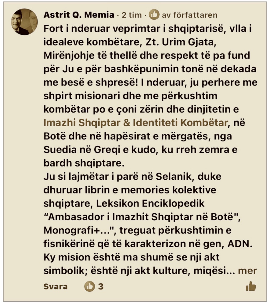 Highly esteemed activist of Albanian national values and brother in our national ideals, Mr. Urim Gjata,